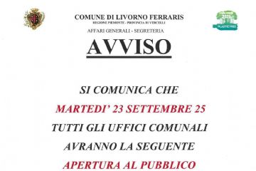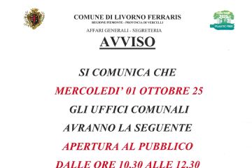 Avviso di modifica orari apertura uffici comunali per il giorno mercoledì 01 ottobre 2025