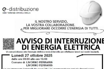 Si comunica che il giorno 27 ottobre 2025 dalle 9 alle 15 sarà interrotta l'energia elettrica per effettuare lavori sugli impianti nelle vie:
