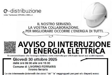 Si comunica che il giorno 30 ottobre 2025 dalle 9 alle 15 sarà interrotta l'energia elettrica per effettuare lavori sugli impianti nelle vie: