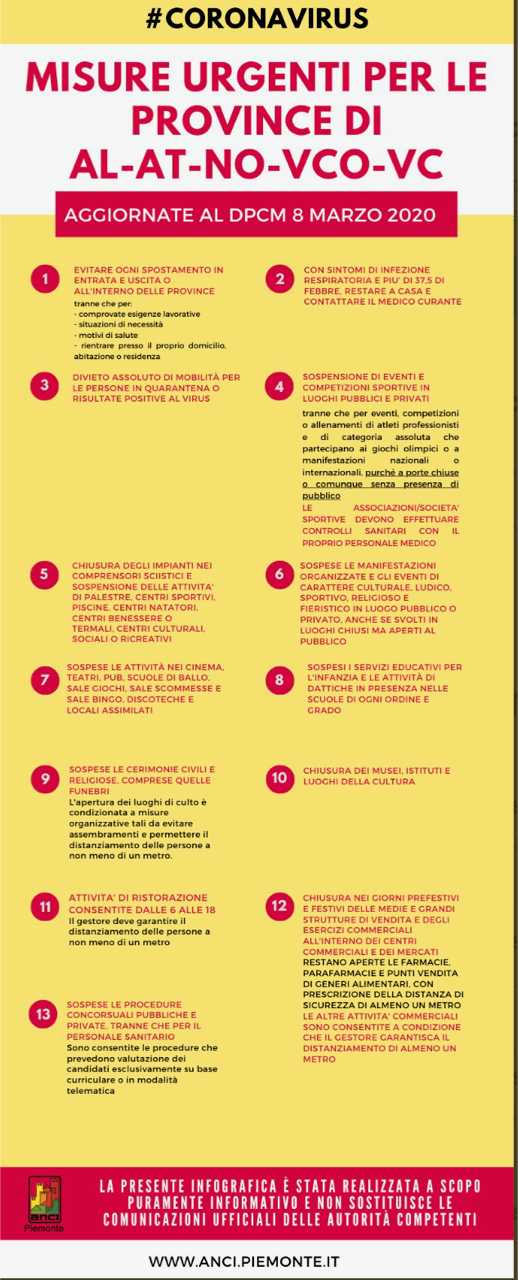 Alla luce del Decreto del Presidente del Consiglio dei Ministri dell' 8 marzo 2020 si allegano il testo del Decreto e delle linee guida pubblicate dall'Associazione Nazionale dei Comuni Italiani (ANCI)