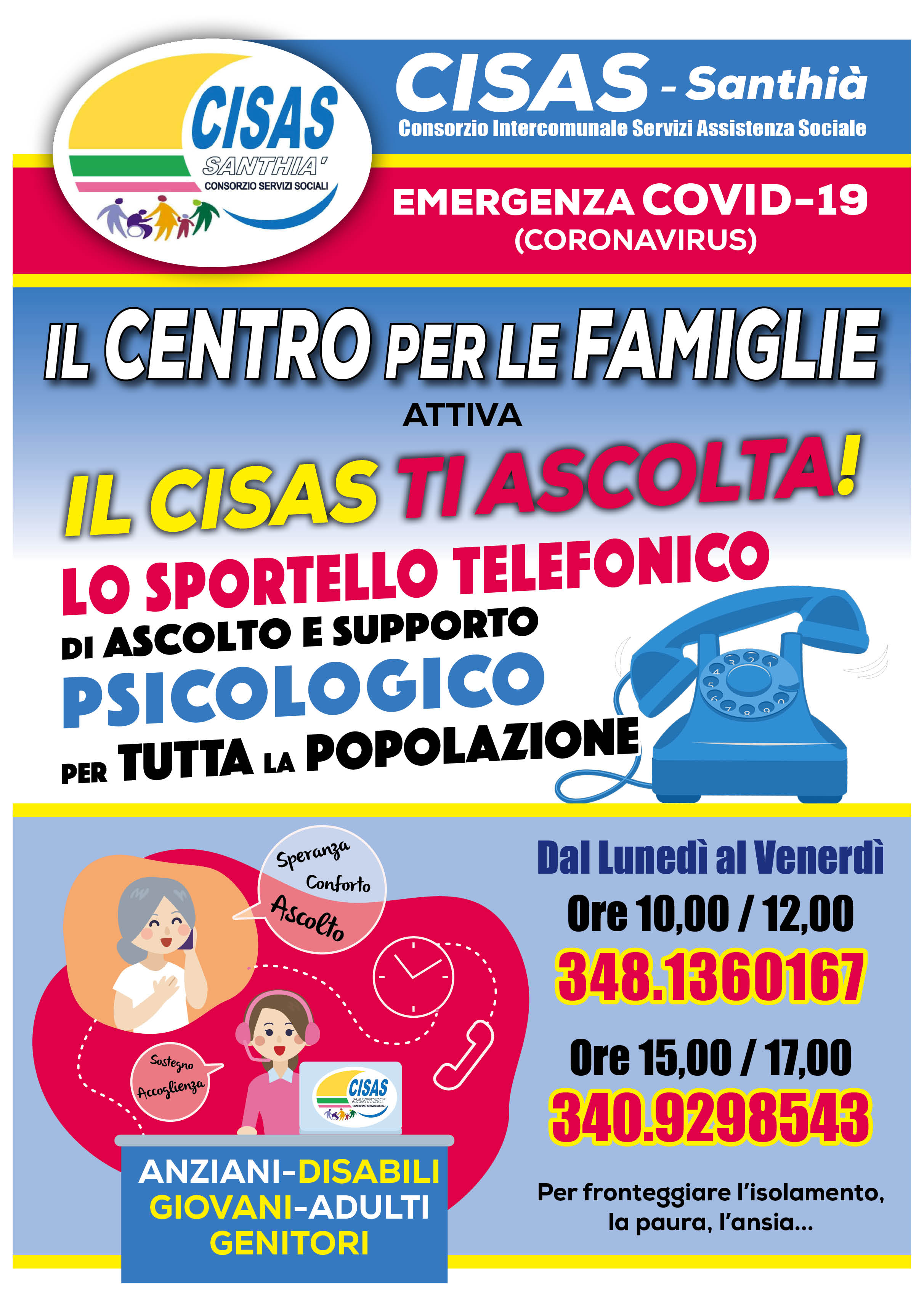 Il centro per le famiglie - il CISAS attiva lo sportello telefonico di ascolto e supporto psicologico per tutta la popolazione. Per maggiori informazioni vedere allegato.