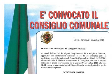 E' convocato il Consiglio Comunale per il giorno 29 novembre 2023 alle ore 18,00 presso la sala consigliare di Palazzo Ferraris aperta al pubblico