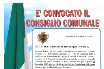 E' convocato il Consiglio Comunale per il giorno 20 dicembre 2023 alle ore 18,00 presso la sala consigliare di Palazzo Ferraris aperta al pubblico