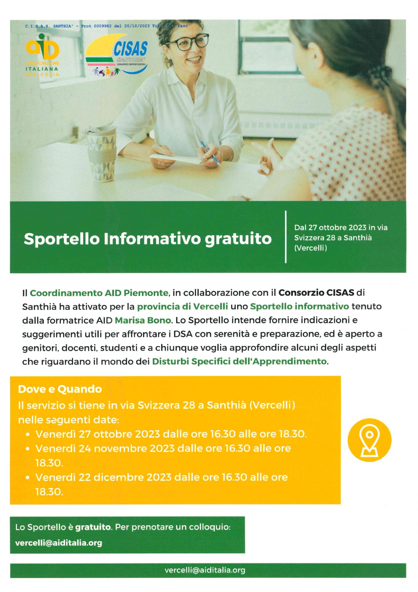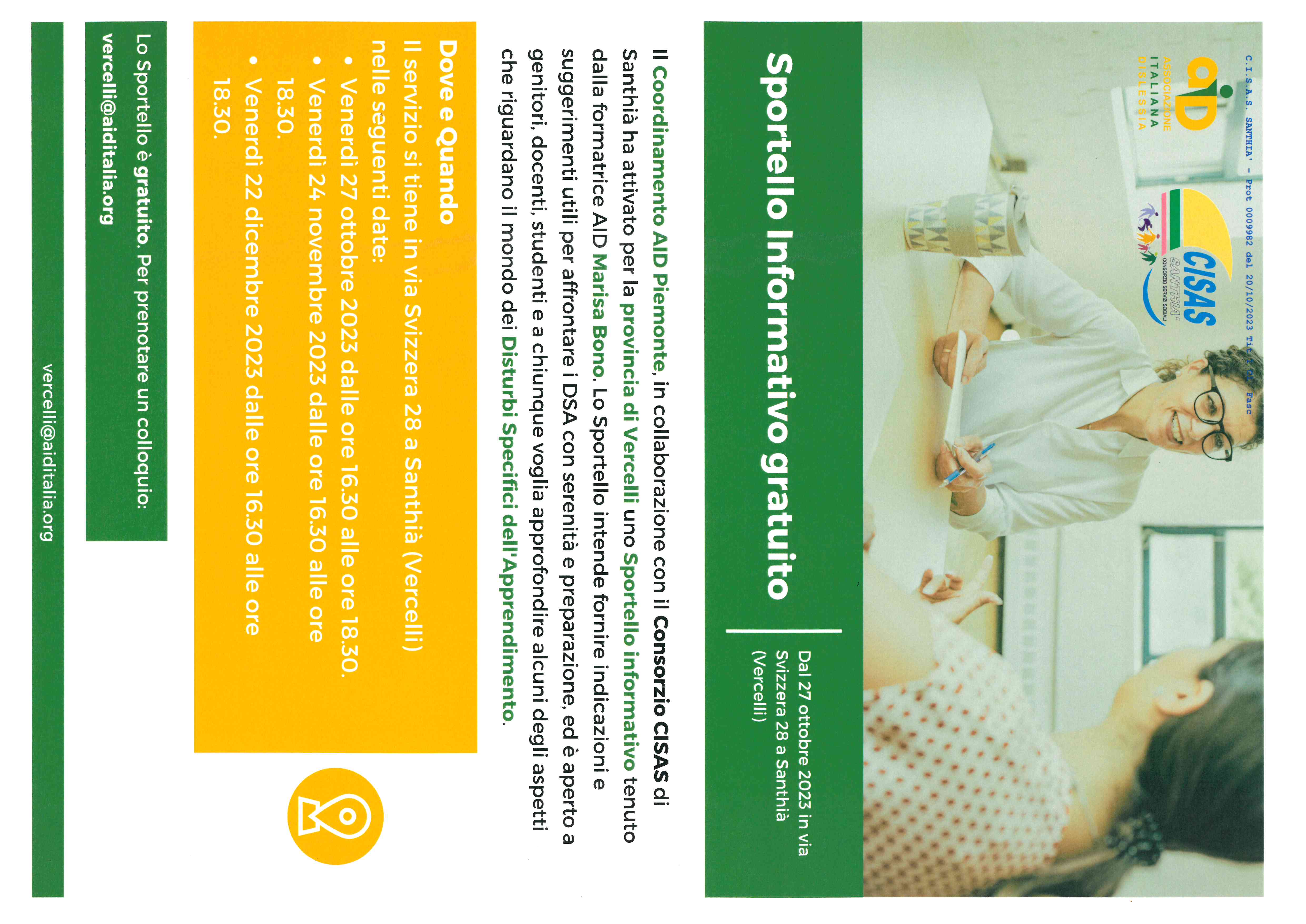 L'Associazione Italiana Dislessia (AID), in collaborazione con il Consorzio CISAS ha attivato uno sportello informativo gratuito che ha lo scopo di fornire indicazioni e suggerimenti utili per affrontare i disturbi specifici di apprendimento (DSA).