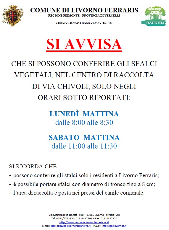 Si avvisa che si possono conferire gli sfalci vegetali, nel centro di raccolta di via Chivoli, sono nei giorni di Lunedì dalle 8:00 alle 8:30 e Sabato dalle 11:00 alle 11:30.