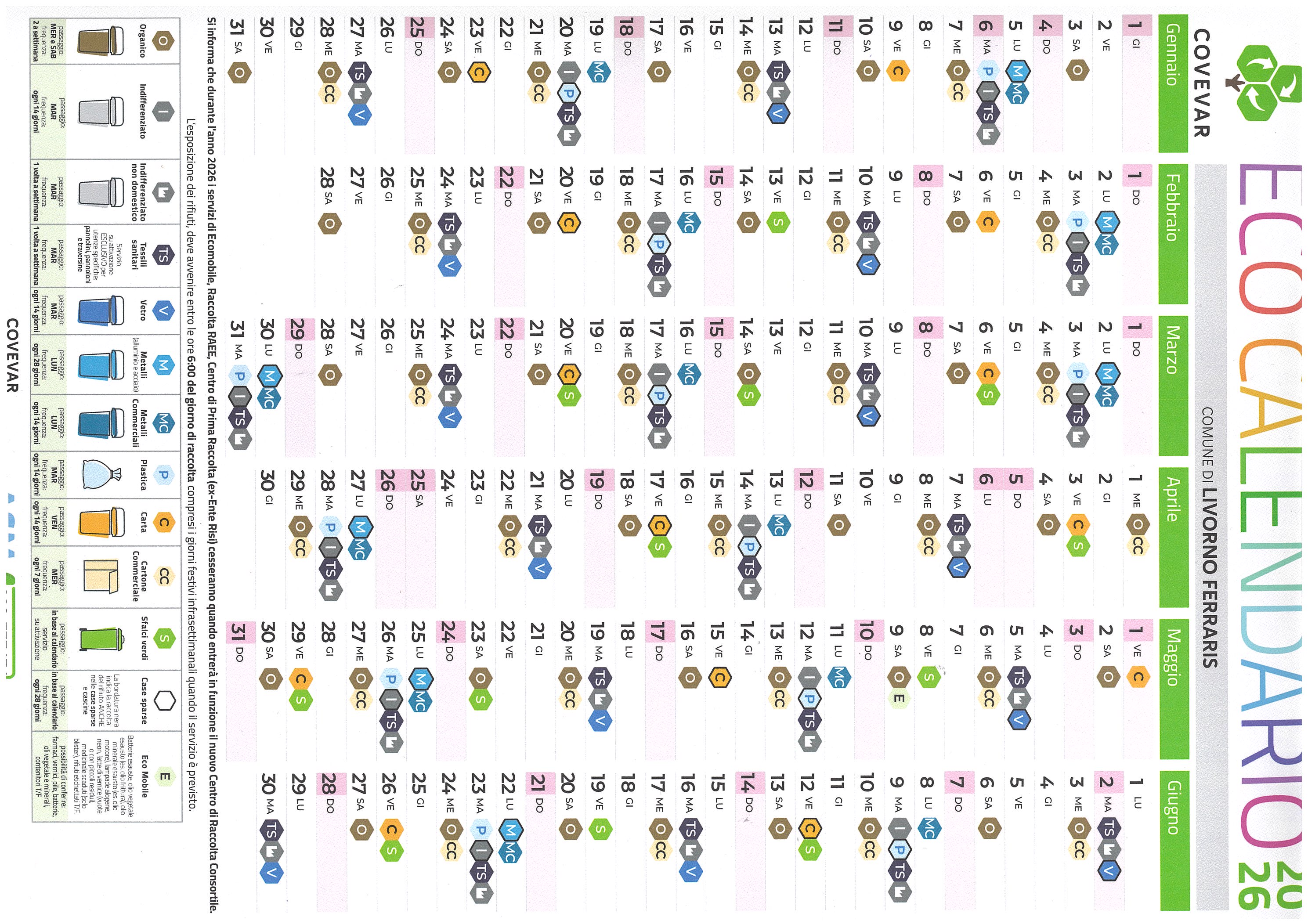Si comunica che sono disponibili i calendari della raccolta dei rifiuti 2026 presso le sedi del comune (in esterno) in Via Martiri della Libertà 100 e della Biblioteca civica (in interno) in Viale IV Novembre 15b.