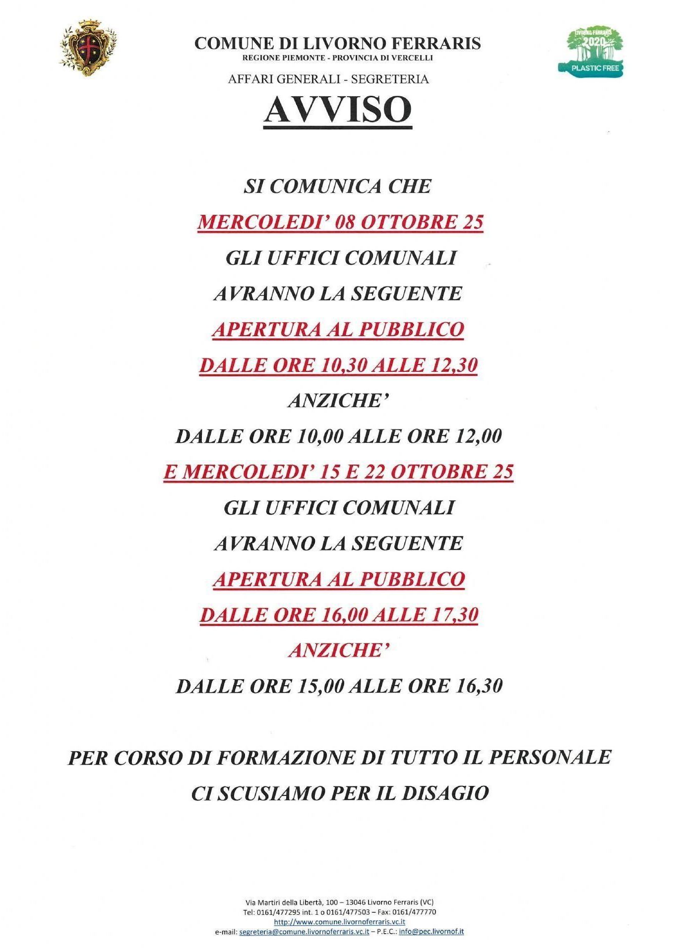 Avviso di modifica orari apertura uffici comunali per i seguenti giorni: