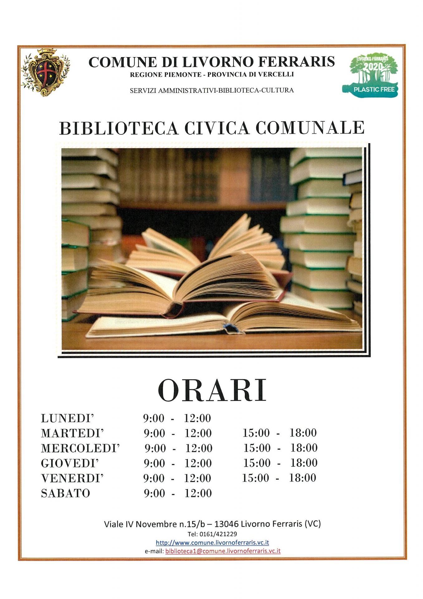 Si avvisa l'utenza che, a partire dalla prossima settimana, la Biblioteca Comunale avrà i seguenti giorni e orari di apertura.