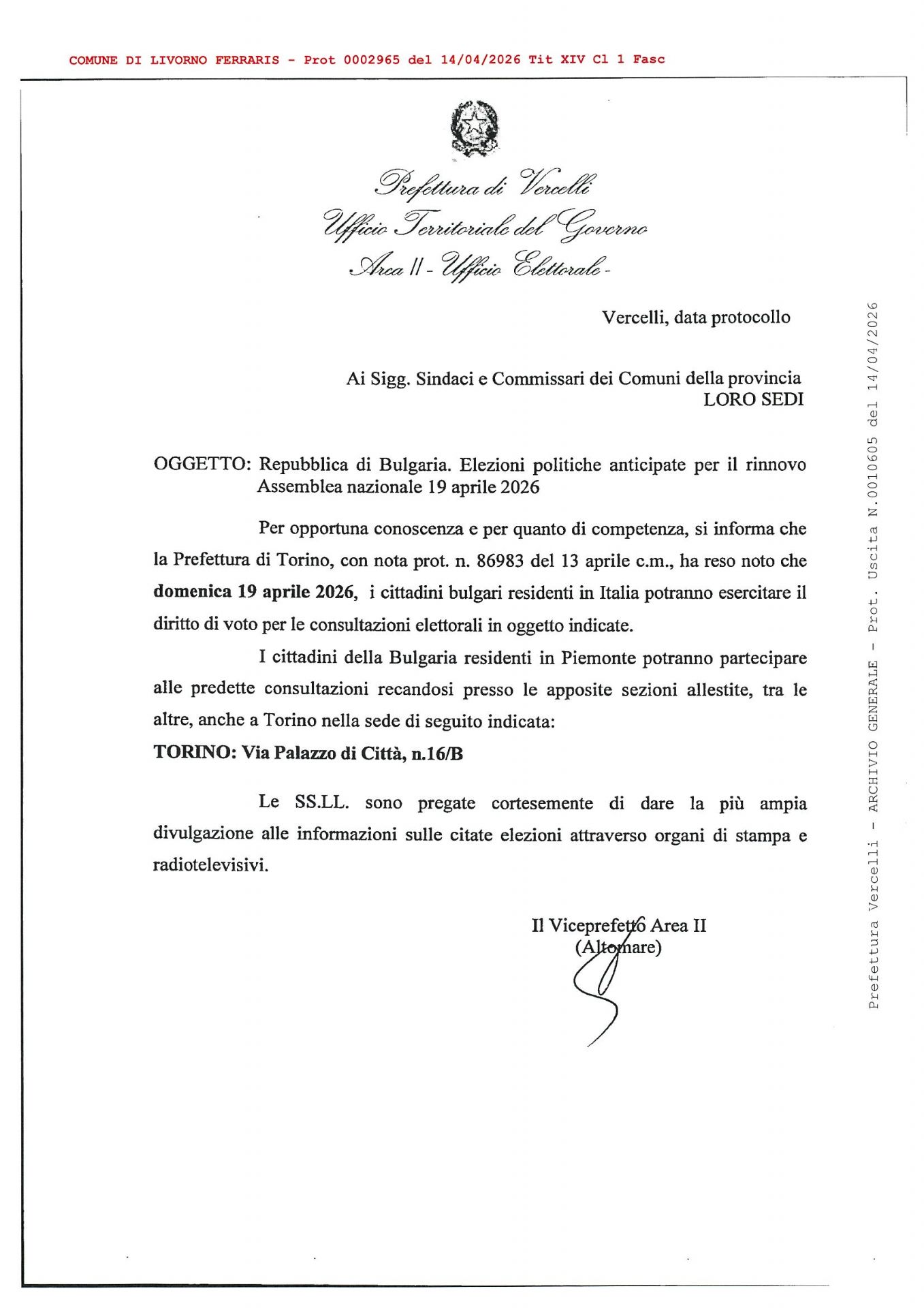 I cittadini bulgari residenti in Piemonte potranno esprimere il loro voto nella sede sita a Torino in Via Palazzo di Città, n. 16/B.