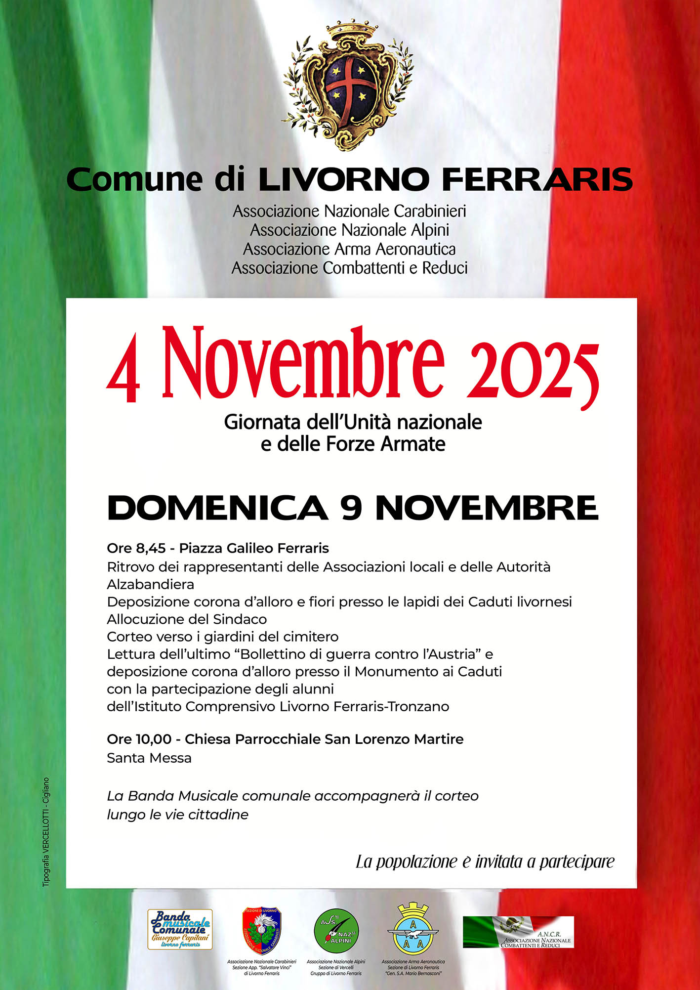 Le celebrazioni del 4 novembre 2025 "Giornata dell'Unità Nazionale e delle Forze Armate" si svolgeranno domenica 9 novembre 2025 dalle ore 8,45 in P.zza G. Ferraris