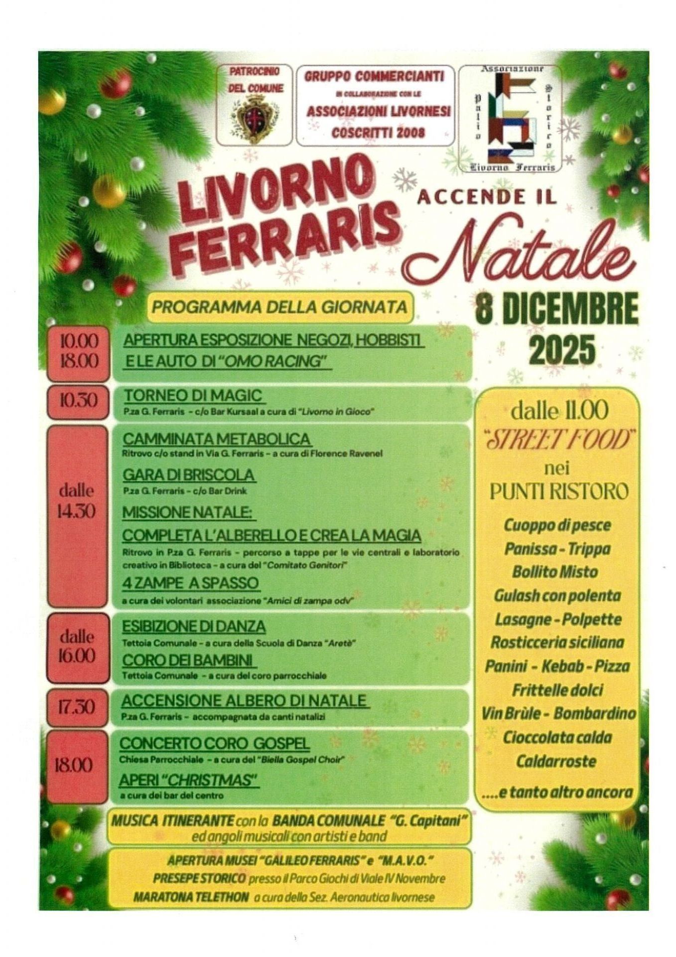 Lunedì 08/12/2025 dalle ore 10 alle ore 18 P.zza G. Ferraris e le vie del Centro (Via G. Ferraris, Via Cavour e Via Martiri della Libertà) saranno luogo di mercatini, street food e varie manifestazioni per grandi e piccoli.